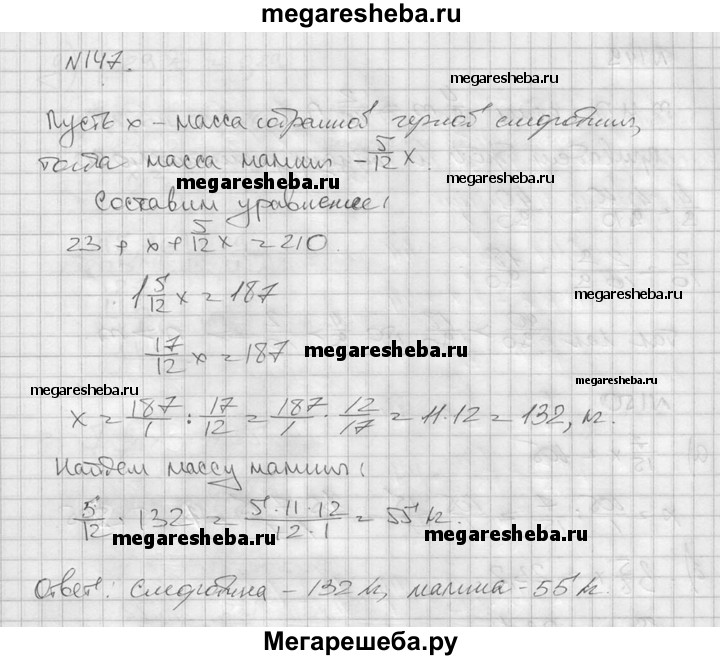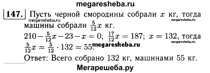 147. С участка собрано 210 кг ягод трех видов. Масса малины составляет 5/12 массы собранной черной смородины. Сколько собрано смородины и малины, если клубники собрано 23 кг?