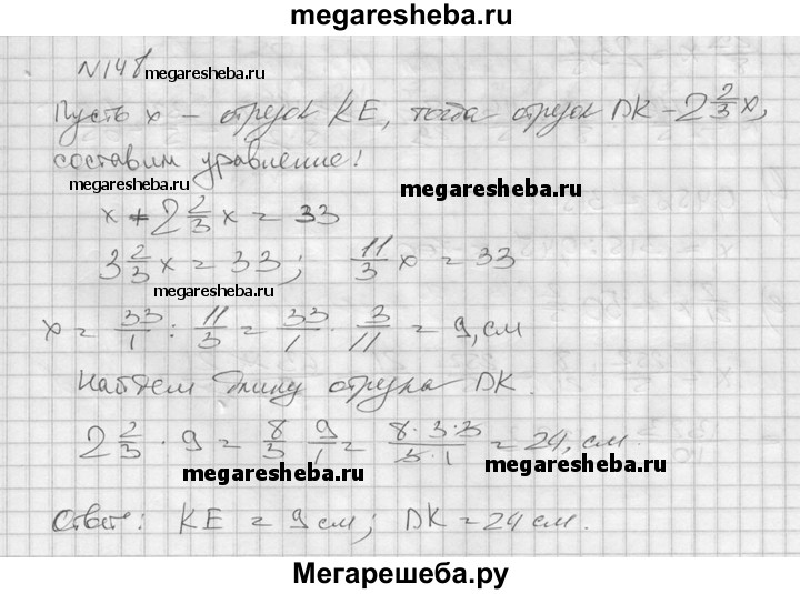 148. Точка К разделила отрезок DE на два отрезка DK и КЕ так, что отрезок DK оказался длиннее отрезка КЕ в 2*2/3 раза. Найдите длину отрезков DK и КЕ, если DE = 33 см.