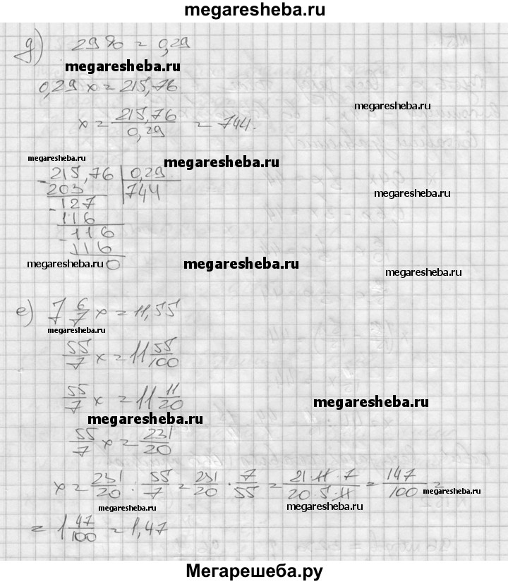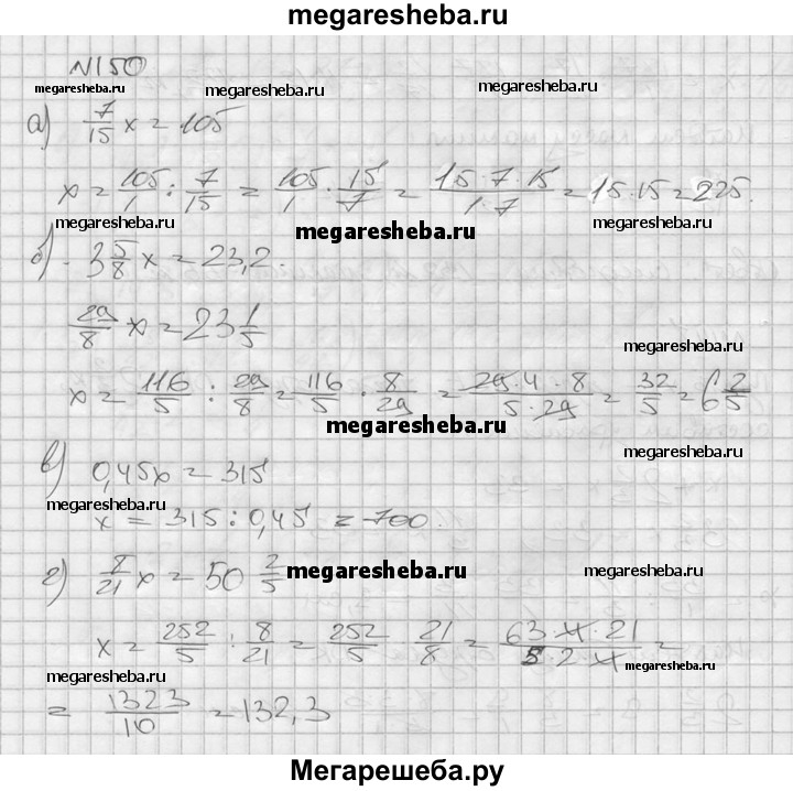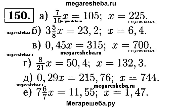 150. Найдите число: а) 7/15 которого равны 105; б) 3*5/8 которого равны 23,2; в) 0,45 которого равны 315; г) 8/21 которого равны 50,4; д) 29% которого равны 215,76; е) 7*6/7 которого равны 11,55.