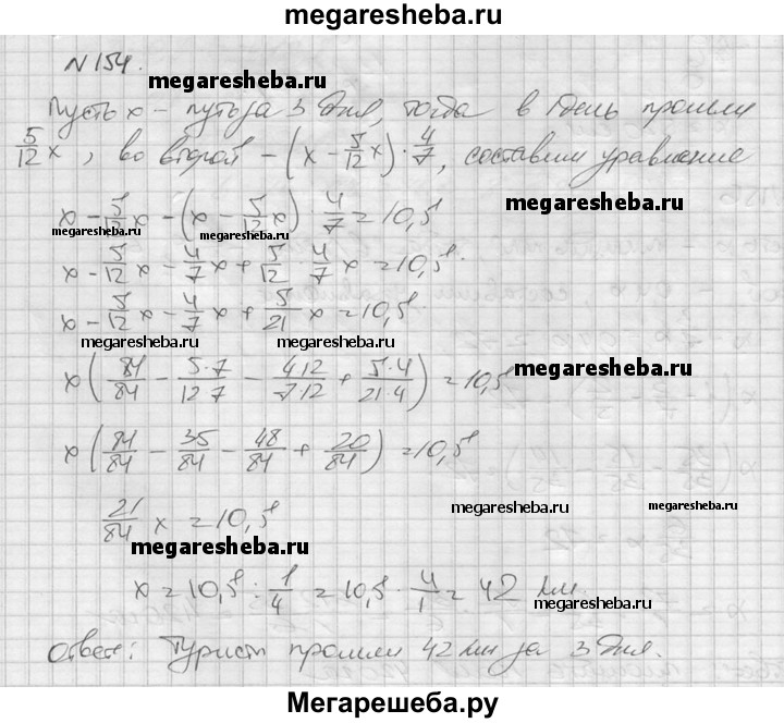 154. Туристы отправились в трехдневный поход. В первый день они прошли 5/12 всего пути, во второй день 4/7 оставшегося после первого дня пути, а в третий день они прошли остальные 10,5 км. Сколько километров прошли туристы за эти три дня?