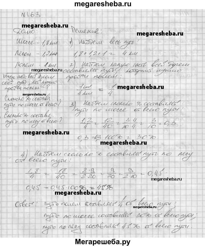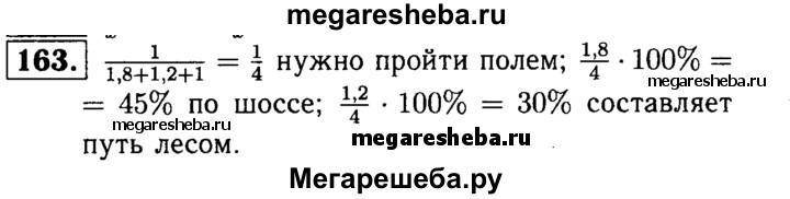 163. Чтобы дойти от станции до садового участка, нужно идти 1,8 км по шоссе, 1,2 км лесом и 1 км полем. Какую часть всей дороги составляет путь, который нужно пройти полем? Сколько процентов составляет путь по шоссе и путь, который идет лесом, от всего пути до садового участка?