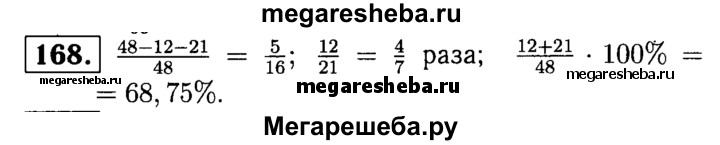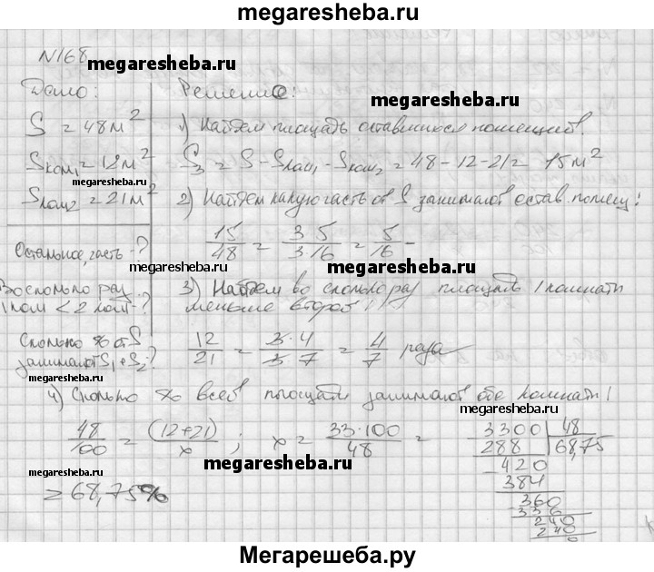168. В квартире площадью 48 м2 одна комната имеет площадь 12 м2, а другая комната 21 м2 . Остальную площадь квартиры занимают кухня, ванная и другие подсобные помещения. Какую часть площади квартиры занимают кухня, ванная и другие подсобные помещения? Во сколько раз площадь первой комнаты меньше второй? Сколько процентов всей площади квартиры занимают обе комнаты?