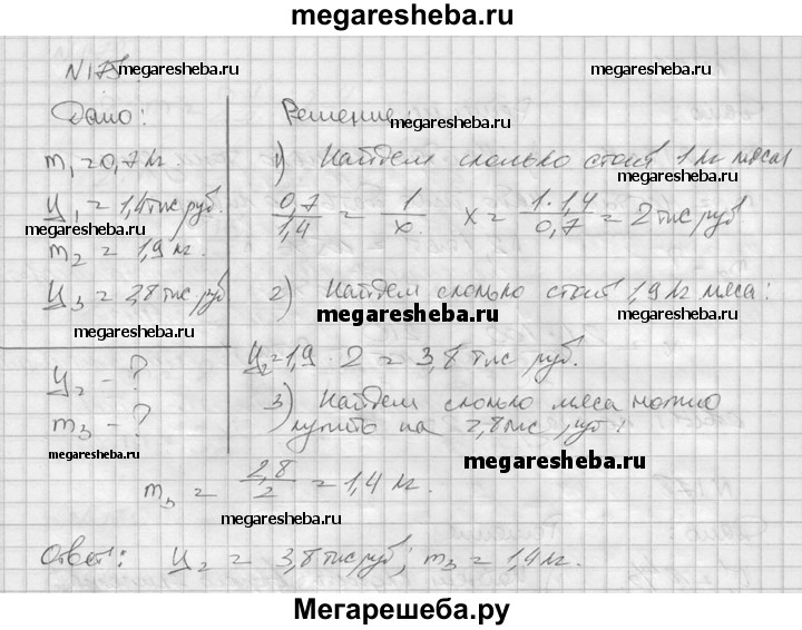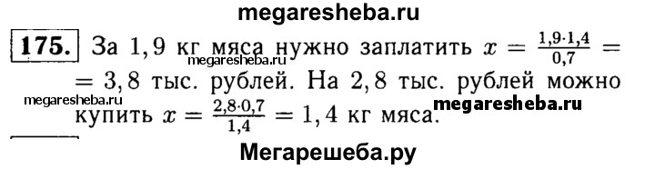 175. За 0,7 кг мяса заплатили 1,4 тыс. рублей. Сколько надо заплатить за 1,9 кг такого мяса? Сколько мяса можно купить на 2,8 тыс. рублей?