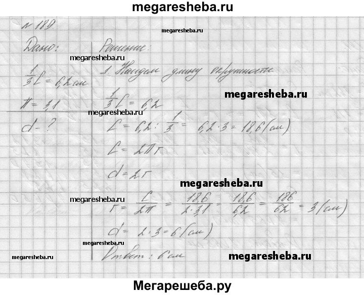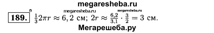 189. Найдите длину диаметра круга, если длина 1/3 окружности, которая ограничивает круг, равна 6,2 см. (Число π округлите до десятых.)