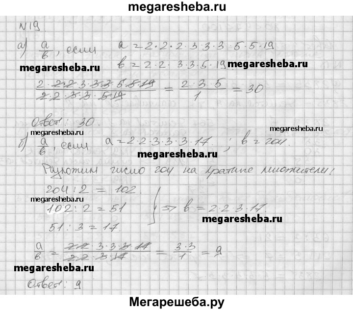19. Найдите частное от деления числа а на число b, если: а) а = 2*2*2*3*3*3*5*5*19, b = 2*2*3*3*5*19 б) а= 2*2*3*3*3*17, b = 204.