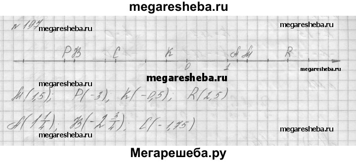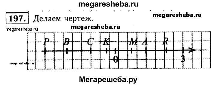 197. Начертите координатную прямую, приняв за единичный отрезок длину четырех клеток тетради. Отметьте на этой прямой точки М(1,5), Р(-3), K(-0,5), R(2,5), A(1*1/4), B(-2*3/4), С(-1,75).
