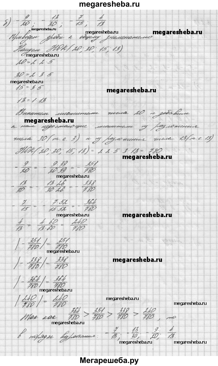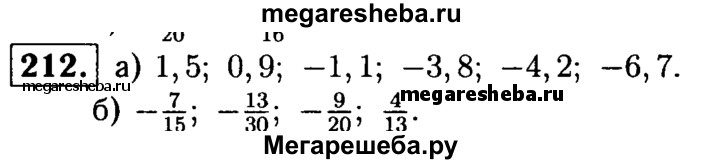 212. Расположите числа: а) -6,7; -3,8; 0,9; -4,2; 1,5 и -1,1 в порядке убывания; б) -9/20; -13/30; - 7/15; 4/13 в порядке возрастания.