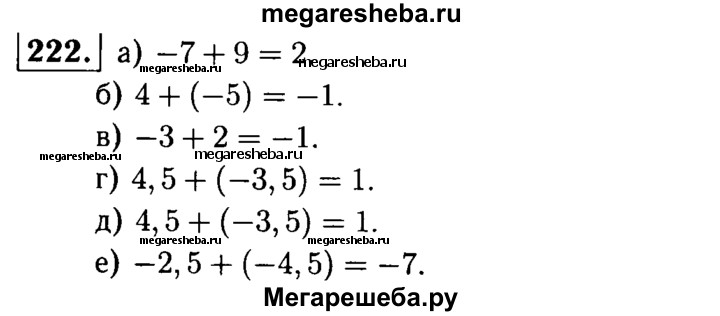 222. С помощью координатной прямой сложите числа: а) -7 и 9; б) 4 и -5; в) -3 и 2; г) 4,5 и -3,5; д) -5 и 2,5 е) -2,5 и -4,5.