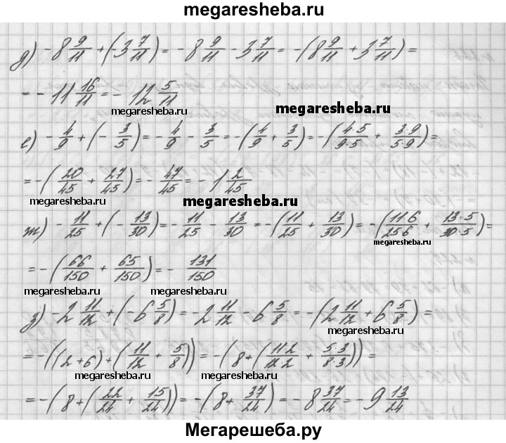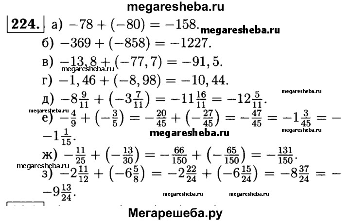 224. Найдите значение суммы: а) -78 + (-80); б) -369 + (-858); в) -13,8 + (-77,7); г) -1,46 + (-8,98); Д) -8*9/11 + (-3*7/11); е) -4/9 + (-3/5); ж) -11/25 + (-13/30); з) -2*11/12 + (-6*58).
