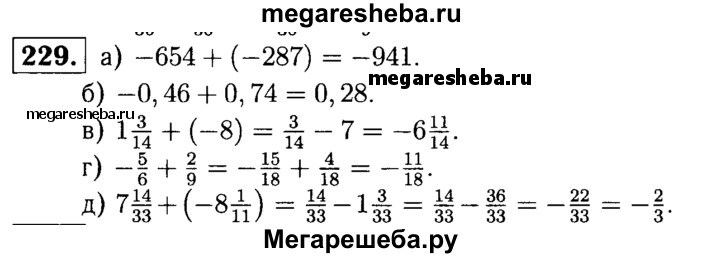 229. Выполните сложение: а) -654 + (-287); б) -0,46 + 0,74; в) 1*3/14 + (-8); г) -5/6 + 2/9; д) 7*14/33 + (-8*1/11).