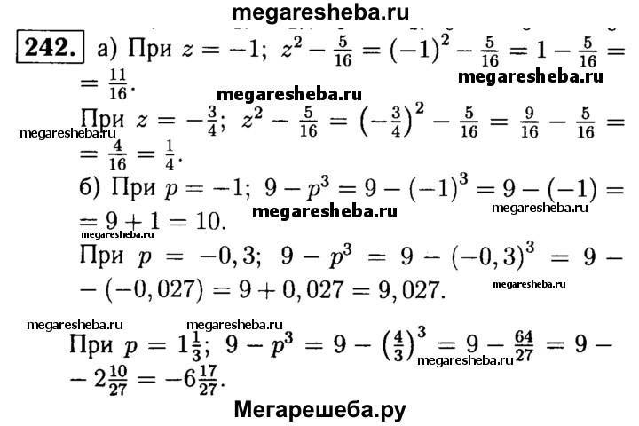 242. Найдите значение выражения: a) z2 – 5/16, если z = -1; z = -3/4; б) 9 - р3, если р = -1; р = 0,3; Р = 1*1/3/