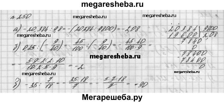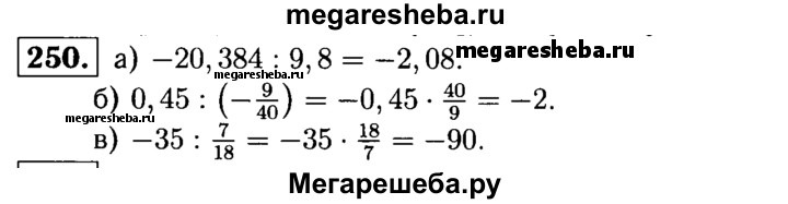 250. Выполните деление: а) -20,384 : 9,8; б) 0,45 : (-9/40) ; в) -35 : 7/18.