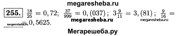 255. Выразите в виде десятичной или периодической дроби 18/25, 37/999, 3*9/11, 9/16.