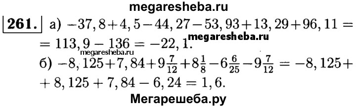261. Найдите значение выражения: а) -37,8 + 4,5 - 44,27 - 53,93 + 13,29 + 96,11; б) -8,125 + 7,84 + 9*7/12 + 8*1/8 – 6*6/25 – 9*7/12.