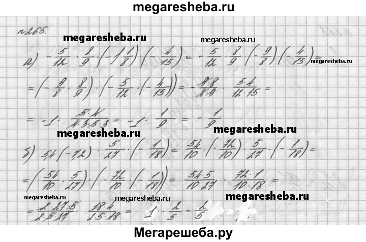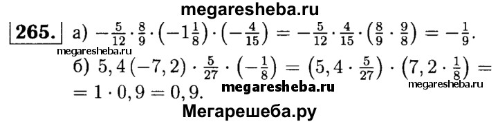 265. Выполните умножение, выбрав удобный порядок вычислении: а) -5/12 * 8/9 * (-1*1/8) * (-4/15); б) 5,4(-7,2) * 5/27 * (-1/18).
