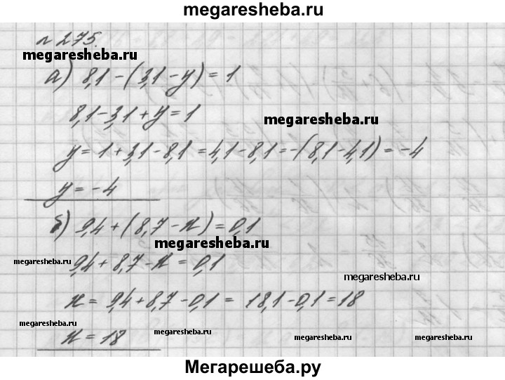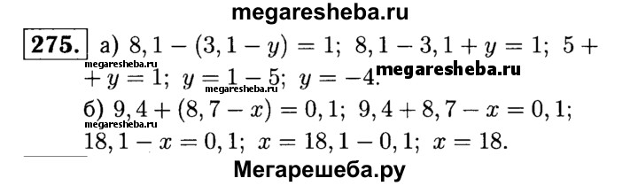 275. Решите уравнение: а) 8,1 - (3,1 - у) =1; б) 9,4 + (8,7 - х) = 0,1.