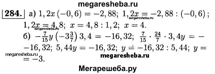 284. Решите уравнение: а) 1,2x (-0,6) = -2,88; б) -7/15y(-3*3/7)3.4 = -16,32.