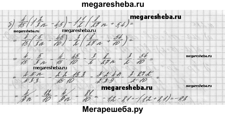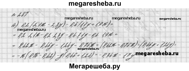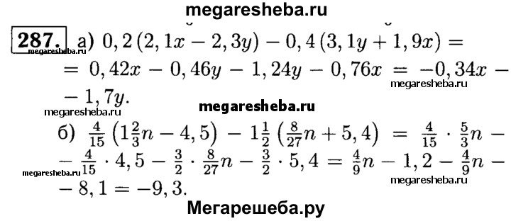287. Упростите: а) 0,2 (2,1х - 2,3у) - 0,4 (3,1у + 1,9х); б) 4/15(1*2/3n – 4,5) – 1*1/2(8/27n + 5,4).