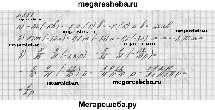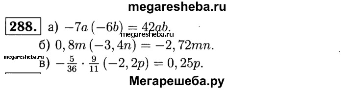288. Упростите выражение: а) -7а(-6b); б) 0,8m(-3,4n); в) -5/36 * 9/11(-2,2p).