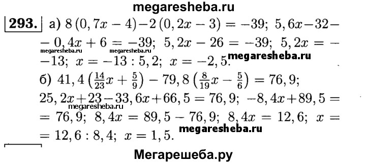 293. Найдите корень уравнения: а) 8 (0,7x - 4) - 2(0,2x - 3) = -39; б) 41,4 (14/23 х + 5/9) - 79,8(8/19х - 5/6) = 76,9.