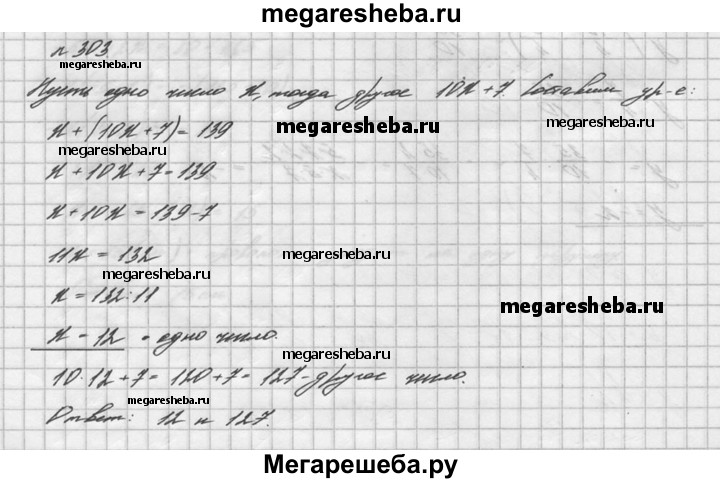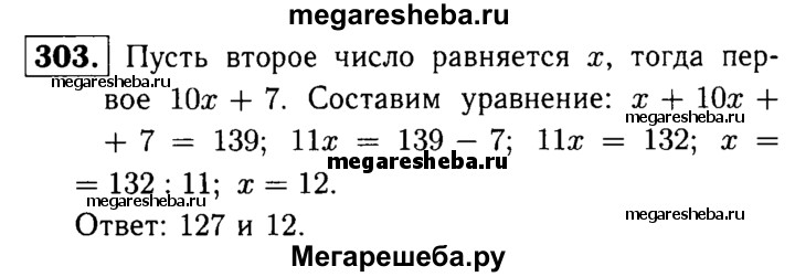 303. Сумма двух натуральных чисел 139. Одно из них оканчивается цифрой 7. Если эту цифру зачеркнуть, то получится второе число. Найдите эти числа.