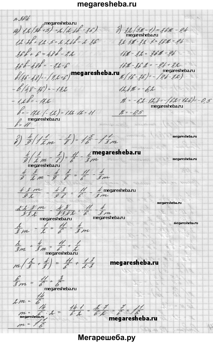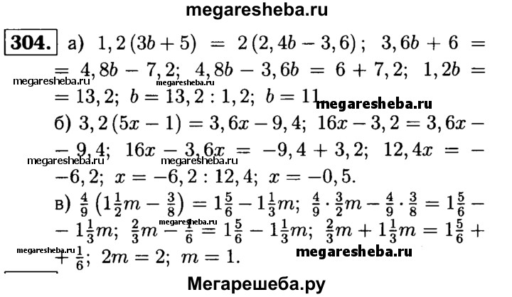 304. Решите уравнение: а) 1,2 (3b + 5) = 2(2,4b - 3,6); б) 3,2 (5х - 1) = 3,6x - 9,4; в) 4/9(1*1/2m – 3/8) = 1*5/6 – 1*1/3m.