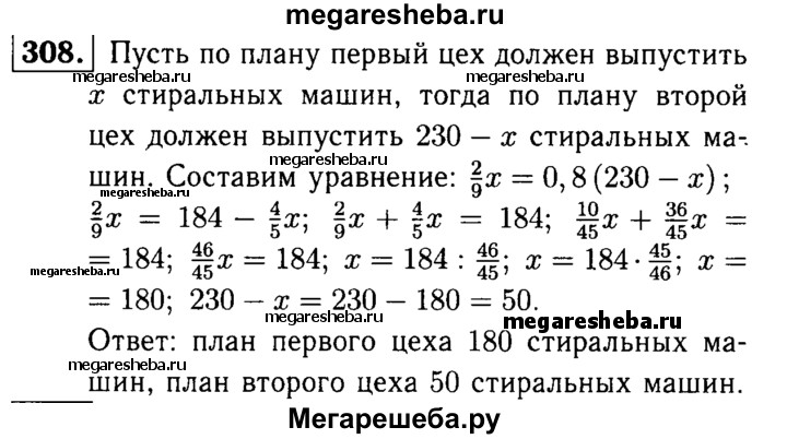 308. По плану два цеха должны выпустить 230 стиральных машин. Причем 2/9 плана первого цеха составляют столько же машин, сколько 80% плана второго цеха. Каков план каждого цеха?