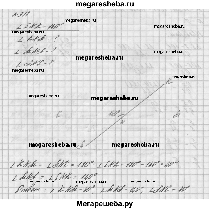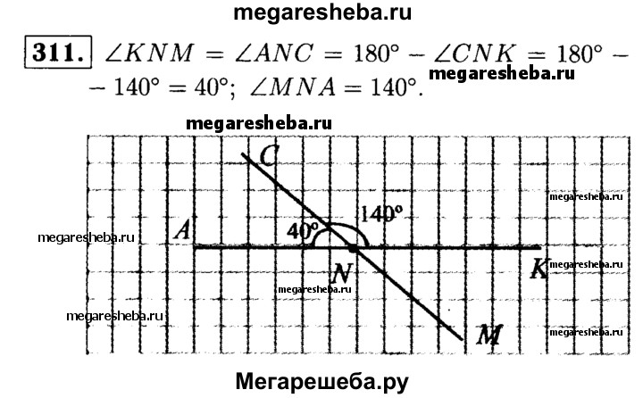 311. Начертите две пересекающиеся в точке N прямые СМ и АК так, чтобы ∟CNK = 140°. Вычислите градусную меру углов KNM, MNA и ANC.
