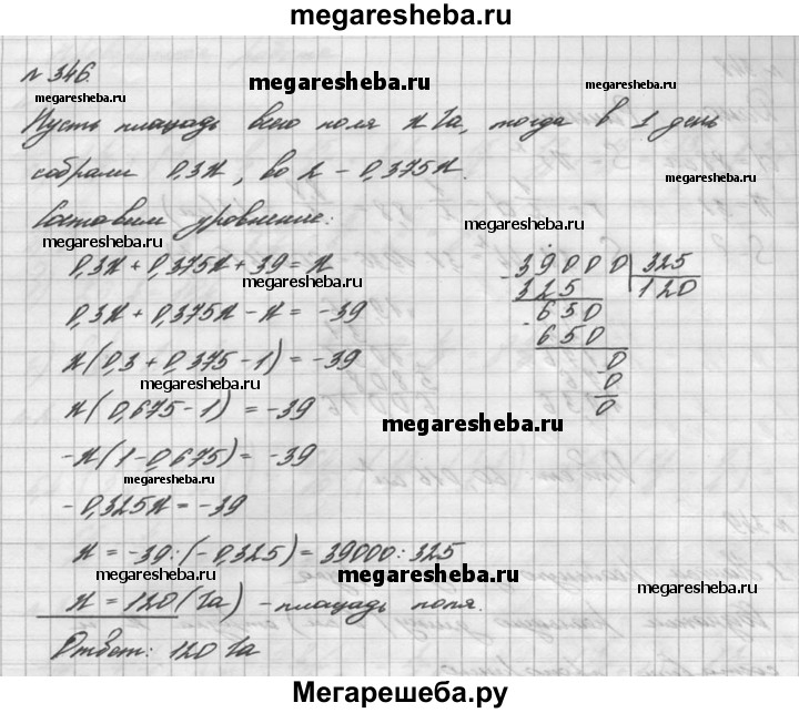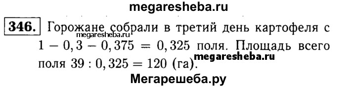 346. Горожане, помогавшие совхозу убирать урожай, собрали в первый день картофель с 0,3 поля, во второй день — с 37,5% поля, а в третий день — с оставшихся 39 га. Найдите площадь всего поля.