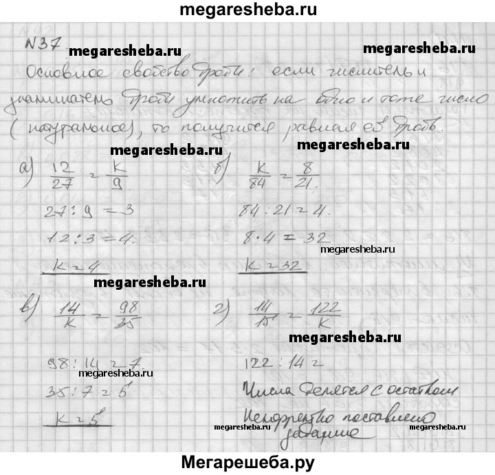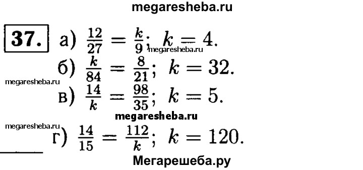 37. Использовав основное свойство дроби, найдите значение k: а) 12/27 = к/9; б) к/84 = 8/21; в) 14/к = 98/35; г) 14/15 = 122/к.