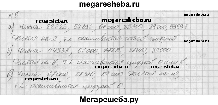 5. Какие из чисел 22 222; 38 753; 44 835; 54 892; 67 000; 77 875; 88 340; 89 000; 99 998 делятся: а) на 2; б) на 5; в) на 10?
