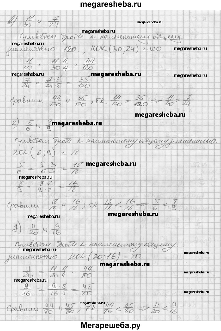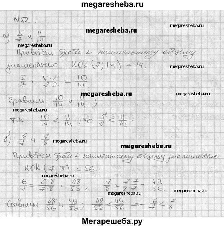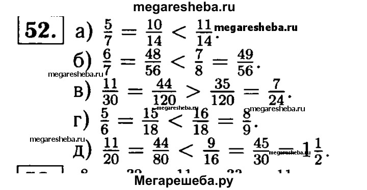 52. Сравните дроби: а) 5/7 и 11/14; б) 6/7 и 7/8; в) 11/30 и 7/24; г) 5/6 и 8/9; д) 11/20 и 9/16.