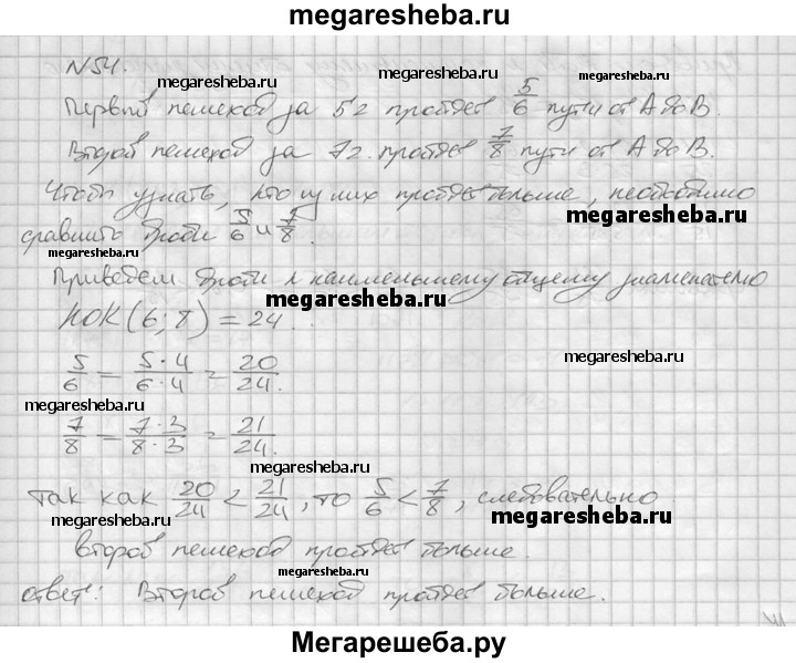 54. Первый пешеход проходит путь от А до В за 6 ч, а второй — за 8 ч. Кто из них пройдет больше: первый за 5 ч или второй за 7 ч?
