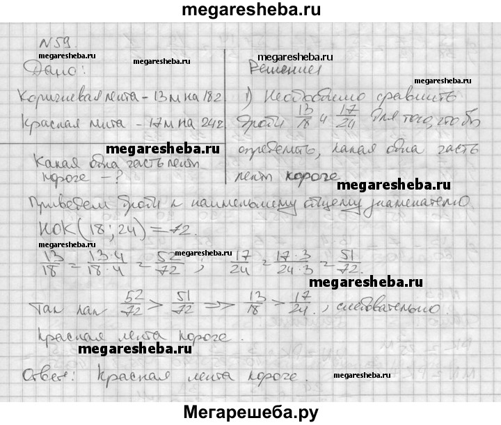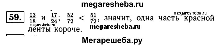 59. Коричневую ленту длиной 13 м разрезали на 18 равных частей, а красную ленту длиной 17 м разрезали на 24 равные части. Какая одна часть ленты короче: коричневая или красная?