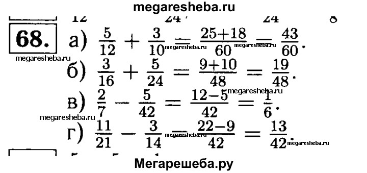 68. Выполните действие: а) 5/12 + 3/10; б) 3/16 + 5/24; в) 2/7 – 5/42; г) 11/21 – 3/14.