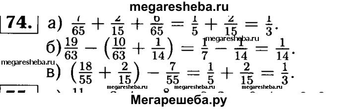 74. Найдите значение выражения, использовав для упрощения вычислений свойства сложения и вычитания: а) 7/65 + 2/15 + 6/65; б) 19/63 – (10/63 + 1/14); в) (18/55 + 2/15) – 7/55.