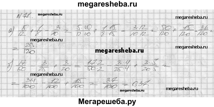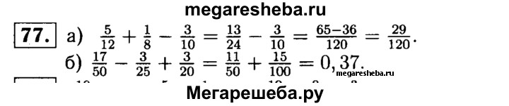 77. Найдите значение выражения: а) 5/12 + 1/8 – 3/10; б) 17/50 – 3/25 + 3/20.