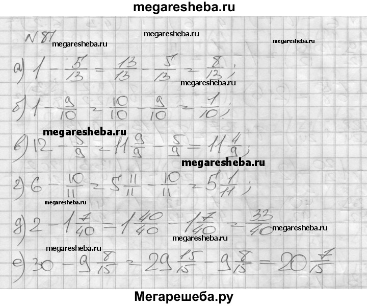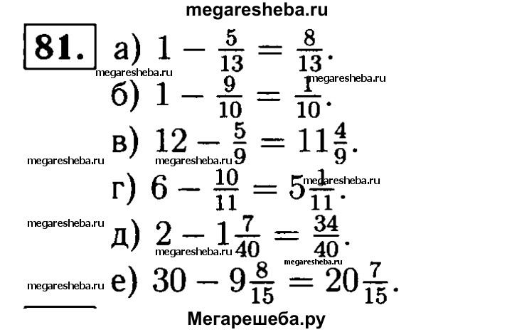 81. Выполните вычитание: а) 1 - 5/13; б) 1 – 9/10; в) 12 – 5/9; г) 6- 10/11; д) 2 - 1*7/40; е) 30 – 9*8/15.