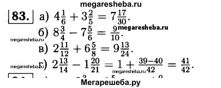 83. Выполните действие: а) 4*1/6 + 3*2/5; б) 8*3/4 – 7*5/6; в) 2*11/12 + 6*5/8; г) 2*13/14 – 1*20/21.