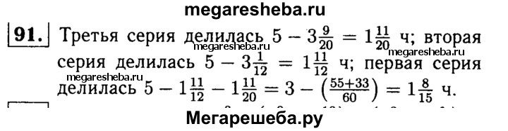 91. Трехсерийный кинофильм шел по телевидению в течение 5 ч. Первая и вторая серии длились 3*9/20ч, а вторая и третья 3*1/12 ч. Сколько времени шла каждая серия?