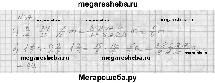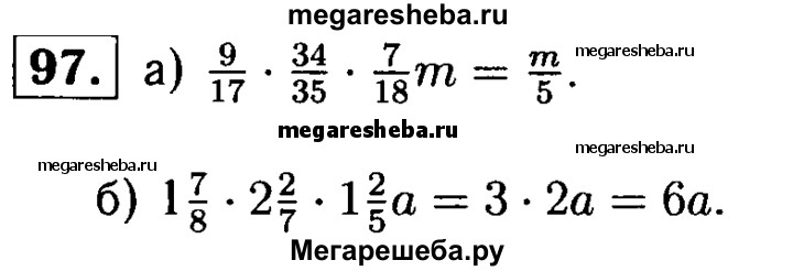 97. Упростите выражение: а) 9/17 * 34/35 * 7/18m; б) 1*7/8а * 2*2/7 * 1*2/5.