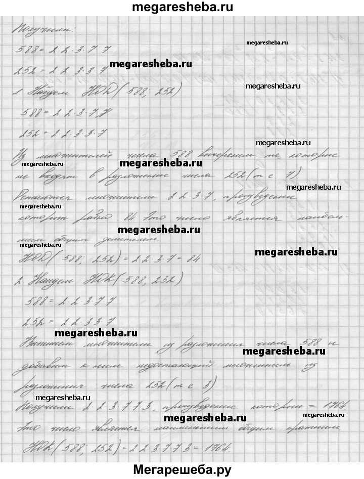 1. Разложите на простые множители число 3276. 2. Найдите наибольший общий делитель и наименьшее общее кратное чисел 588 и 252. 3. Выполните действия: 316,8 : 0,48 - 8,47 * 23. 4. Докажите, что числа 476 и 855 взаимно простые. 5. Может ли разность двух простых чисел быть простым числом?