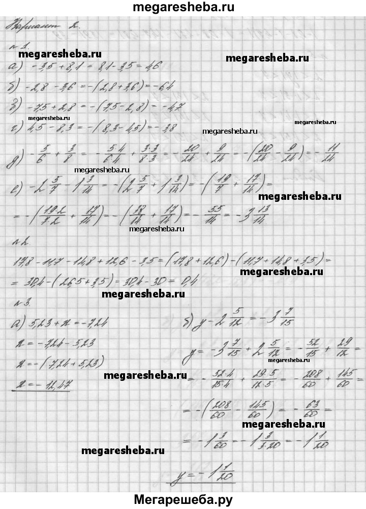 1. Выполните действие: а) -3,5 + 8,1 б) - 2,8 - 3,6 в) -7,5 + 2,8 г) 4,5 - 8,3 д) -5/6 + 3/8 е) -2*5/7 – 1*3/14. 2. Найдите значение выражения: 17,8 -11,7 - 14,8 +12,6 - 3,5. 3. Решите уравнение: а) 5,23 + х = -7,24 б) у – 2*5/12 = -3*7/15. 4. Найдите расстояние между точками С (-4,7) и D (-0,8) координатной оси. 5. Напишите все целые значения у, при которых верно неравенство 2 <│ у│ <7.