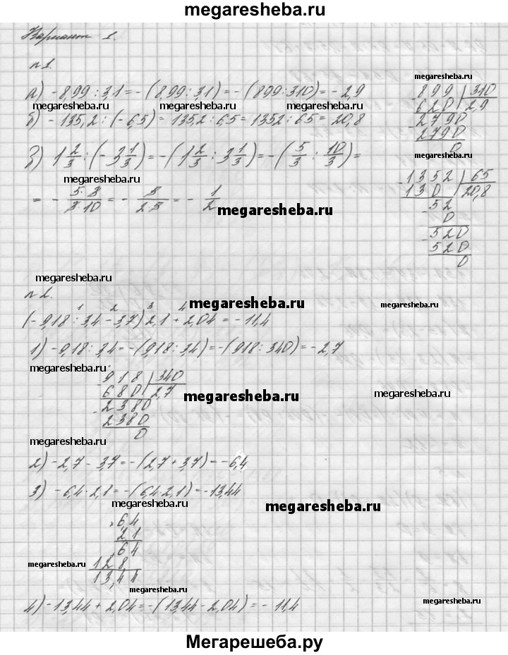 1. Выполните действие: а) -8,99 : 3,1 б) -135,2 : (-6,5) в) 12/3 : (-3*1/3). 2. Найдите значение выражения (-9,18 : 3,4 - 3,7)2,1 + 2,04. 3. Решите уравнение 0,6(х + 7) = 0,5(х - 3) + 6,8. 4. При каких значениях х выражение 1,5х - 3,7 равно выражению 2,3х - 2,74? 5. Найдите корни уравнения (6х - 9) (4х + 0,4) = 0.