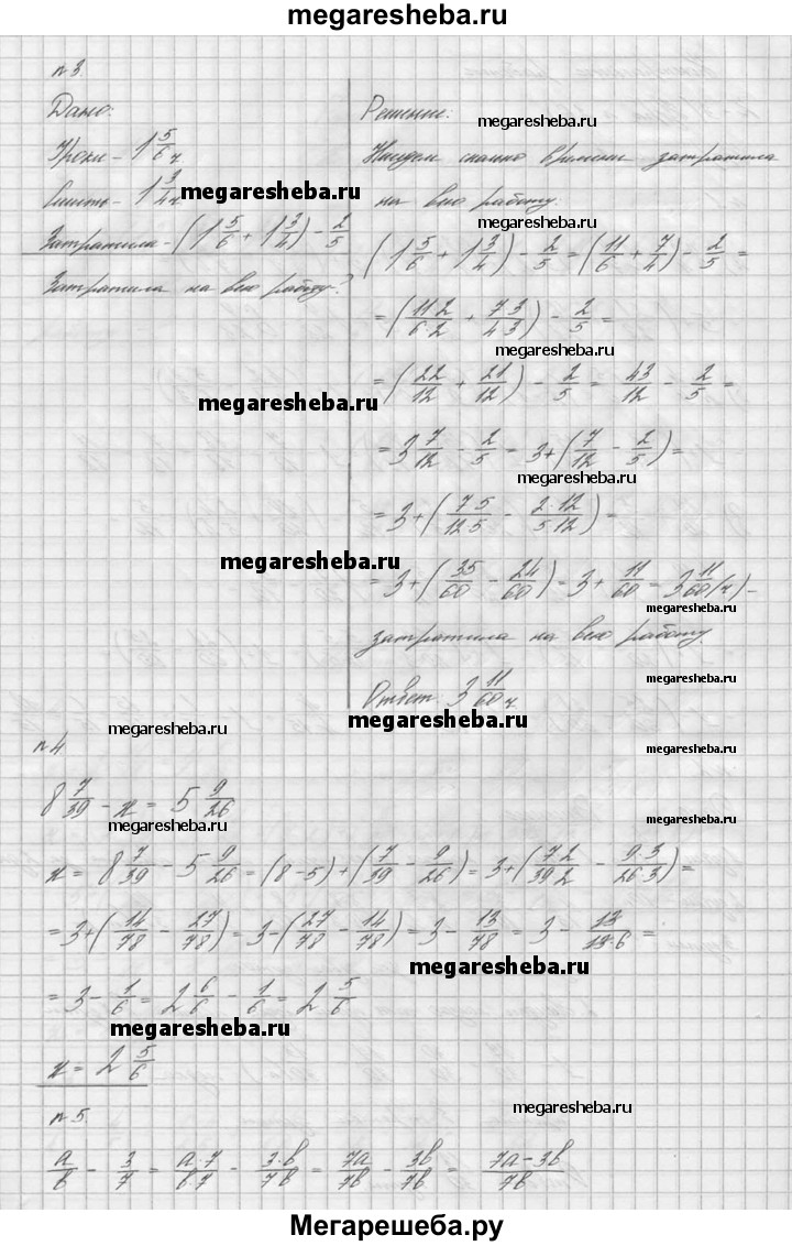 1. Найдите значение выражения: а) 3*3/4 + 2*4/7 б) 2*4/9 – 1*5/6 в) 19/20 – 5/12 + 2/5. 2. Подводная лодка шла трое суток. В первые сутки она прошла 4/15 намеченного пути, а во вторые сутки 3/10 пути. Какую часть пути прошла подводная лодка в третьи сутки? 3. Ученица рассчитывала за 1*5/6 ч приготовить уроки и за 1*3/4 ч сшить платье. Однако на всю работу она затратила на 2/5 ч меньше, чем рассчитывала. Сколько времени потратила ученица на вою эту работу? 4. Решите уравнение 8*7/39 - х = 5*9/26. 5. Представьте в виде дроби выражение a/b – 3/7.