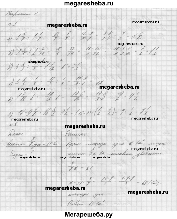 1. Выполните действия: а) 1*5/7 : 1*1/7 б) 3*1/5 : 2*2/15 в) 5*2/3 : 1/3 – 1*7/12 * 6. 2. Скосили 3/7 луга. Найдите площадь луга, если скосили 21 га. 3. В первый час автомашина проехала 27% намеченного пути, после чего ей осталось пройти еще 146 км. Сколько километров составляет длина намеченного пути? 4. За 3/4 кг конфет заплатили 1*4/5 тыс. рублей. Сколько стоят 2*1/2 кг таких конфет? 5. Два одинаковых сосуда заполнены жидкостью. Из первого сосуда взяли 7/16 имевшейся там жидкости, а из второго сосуда 8/17 имевшейся там жидкости. В каком сосуде осталось больше жидкости?