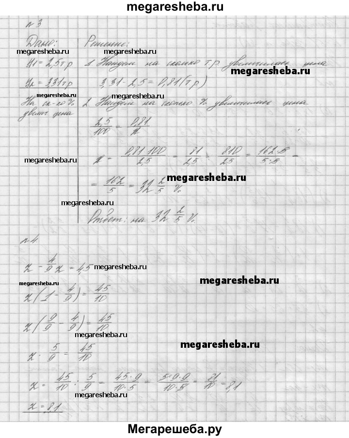 1. Найдите значение выражения: а) 13,8 : 3*5/6 – 3*1/5 б) (18*1/4 – 17*5/6) * 8,4 + 6,5. 2. Масса пустого бидона 1,6 кг, а масса подсолнечного масла, находящегося в бидоне, равна 4 кг. Во сколько раз масса масла больше массы пустого бидона? Какую часть общей массы бидона с маслом составляет масса пустого бидона? 3. С включением в книгу цветных иллюстраций ее цена поднялась с 2,5 тыс. рублей до 3,31 тыс. рублей. На сколько процентов увеличилась цена книги? 4. Решите уравнение z - 4/9z = 4,5. 5. Сколько имеется несократимых правильных дробей со знаменателем 133?