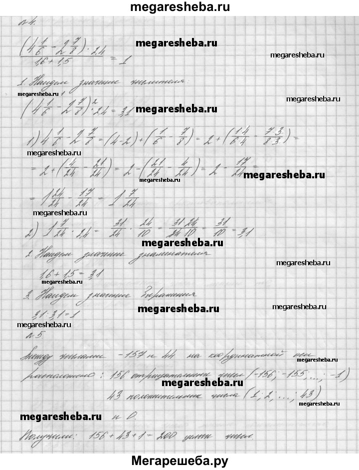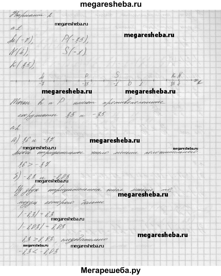 1. Отметьте на координатной оси точки М(-7), N (4), К (3,5), Р (-3,5) и S (-1). Какие из отмеченных точек имеют противоположные координаты? 2. Сравните числа: а) 3,6 и -3,7 б) -8,3 и -8,03 в) -4/5 и -5/6. 3. Найдите значение выражения: а) | 5,4 |: | -27 | б) | -1*3/8 |* | -2*2/11 | в) | 3,8 |- | -2*1/2 |. 4. Вычислите: (4*1/6 – 2*7/8) * 2,4 / 1,6 + 1,5. 5. Сколько целых чисел расположено на координатной оси между числами -157 и 44?
