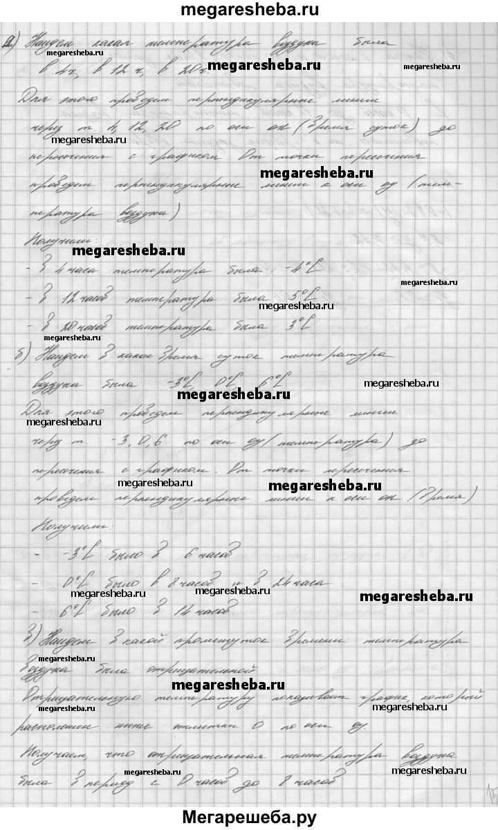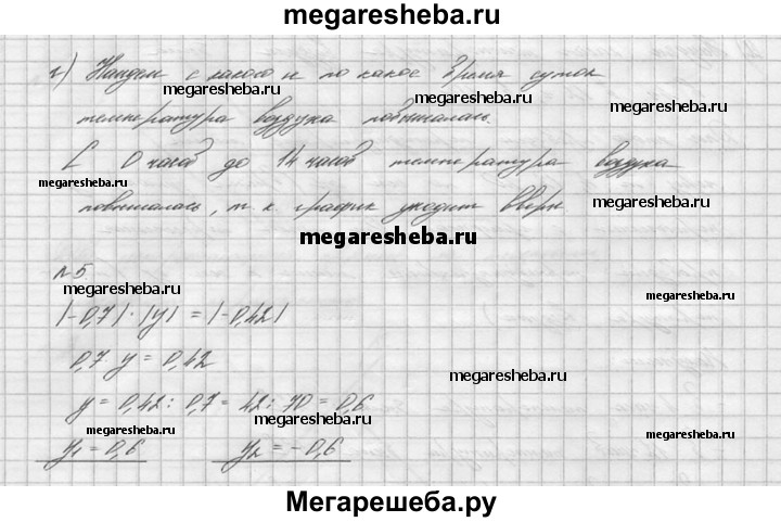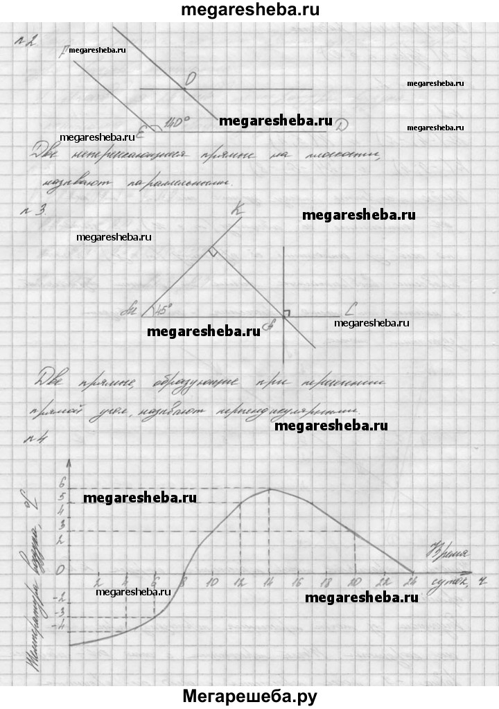 1. На координатной плоскости проведите через точки М (-4; -2) и N (5; 4) прямую, а точки К (-9; 4) и D (-6; -8) соедините отрезком. Найдите координаты точки пересечения отрезка KD и прямой MN, 2. Постройте угол DEF, равный 140°. Отметьте внутри этого угла точку О и проведите через нее прямые, параллельные сторонам угла DEF. 3. Постройте угол СМ К, равный 45°. Отметьте на стороне МС точку А и проведите через нее прямые, перпендикулярные сторонам угла СМК. 4. На рисунке изображен график изменения температуры воздуха в течение суток. Рассмотрев график, ответьте на вопросы: а) Какая температура воздуха была в 4 ч, в 12 ч, в 20 ч? б) В какое время суток температура воздуха была -3 °С, 0 °С, 6 °С? в) В какой промежуток времени температура воздуха была отрицательной? г) С какого и по какое время суток температура воздуха повышалась? 5. Найдите два корня уравнения | -0,7 | * | у | = | -0,42 |.