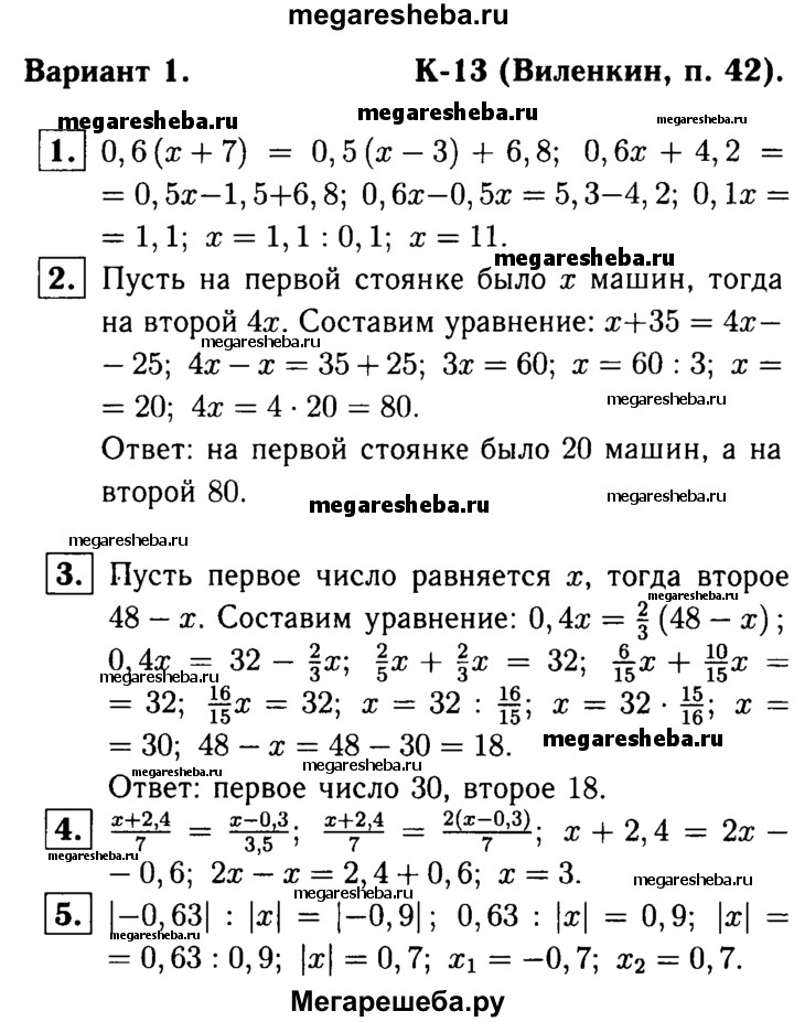 1. Решите уравнение 0,6(х + 7) = 0,5(х-3) + 6,8. 2. На первой стоянке в 4 раза меньше автомашин, чем на второй. После того как на первую приехали 35 автомашин, а со второй уехали 25 автомашин, автомашин на стоянках стало поровну. Сколько автомашин было на каждой стоянке первоначально? 3. Сумма двух чисел равна 48. Найдите эти числа, если 40% одного из них равны 2/3 другого. 4. При каких значениях х выражения х + 2,4 / 7 и х – 3 / 3,5. будут равны? 5. Найдите два корня уравнения | -0,63 |: | х | = | -0,9 |.